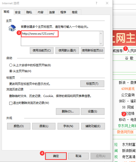 2、常规-主页内输入http://www.wu123.com/,关闭即可 。 |