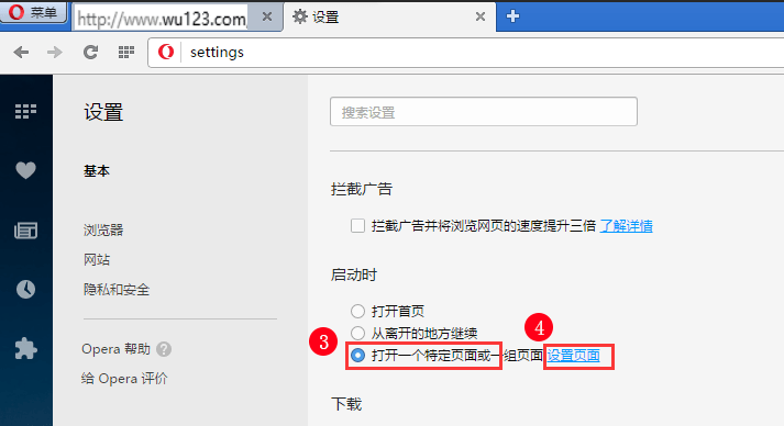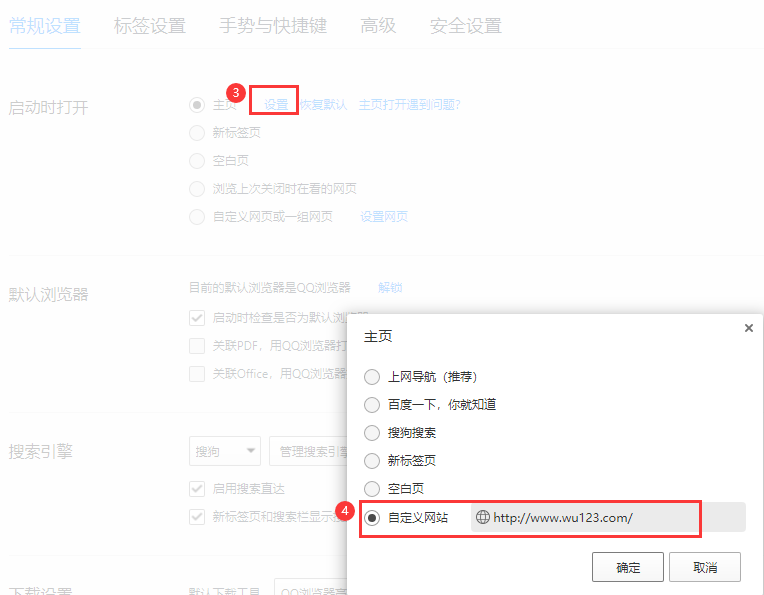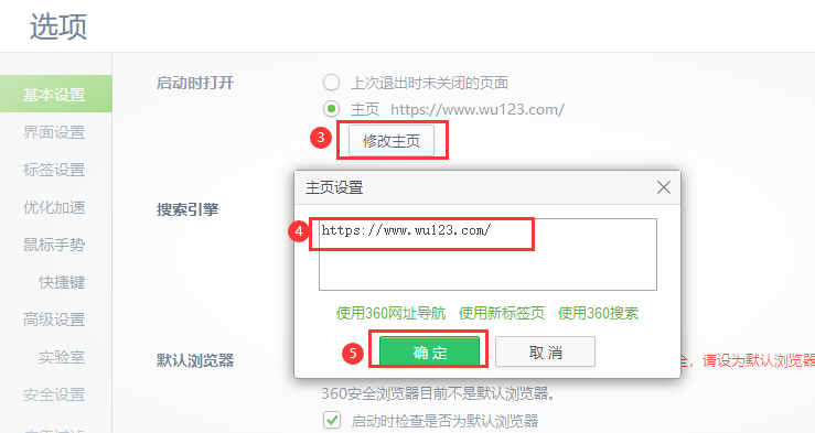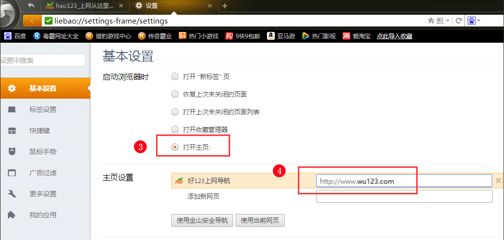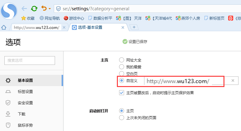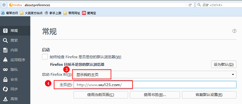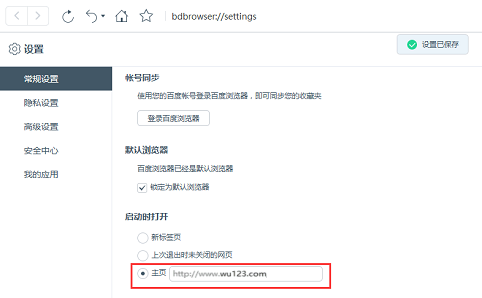 选择打开主页标签,在主页设置里输入http://www.wu123.com/,设置自动保存,重启浏览器即可。 |