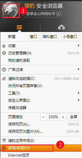 按照如下方式操作:1、打开猎豹浏览器,点击浏览器图标-选项/设置,如图所示: |