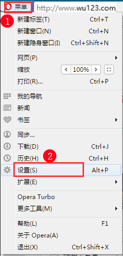 按照如下方式操作:1、打开Opera浏览器,点击菜单按钮—设置,如图所示: |